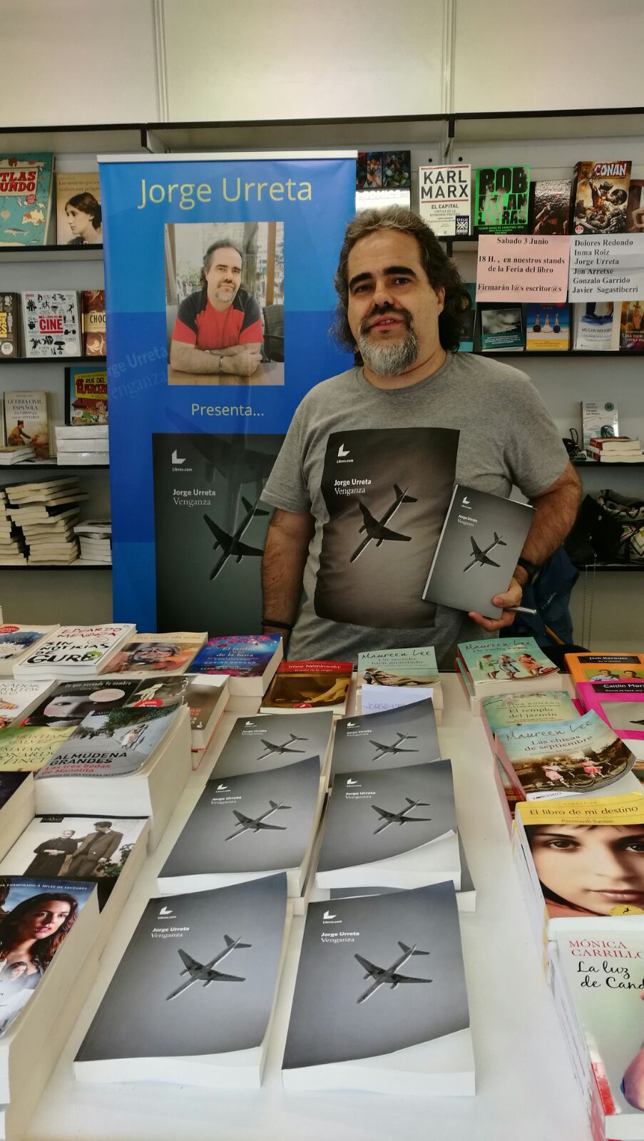 Ahora, os dejo con una foto del sitio en el que estuve firmando el fin de semana en Bilbao. Cuando vayáis a verme este próximo fin de semana, así será como me veréis. La foto es de la tarde del sábado, y, como podéis ver, ya no quedaban muchos ejemplares por firmar.